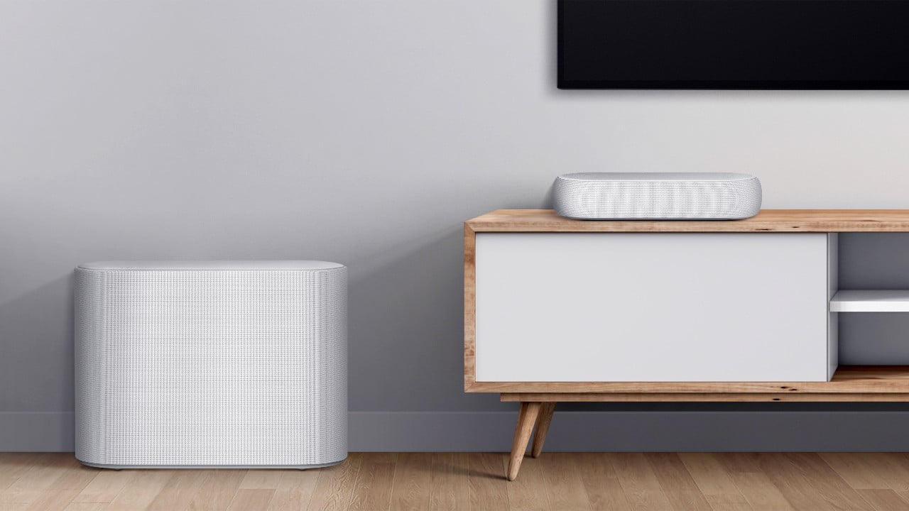 To be frank, it’s so small it looks more like a Bluetooth speaker with a subwoofer, but that’s not a bad thing. Offered in black or white, the oval styling with jersey fabric exterior makes it decor-friendly.